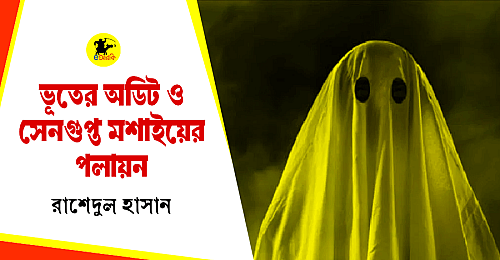 টেবিলে তার গত মাসের সংসারের খরচের খাতাটা খোলা। আর সেই খাতার ওপর ঝুঁকে বসে আছে এক ছায়ামূর্তি। অবয়বটা ধোঁয়াশা, কিন্তু স্পষ্ট বোঝা যাচ্ছে—ভদ্রলোকরূপী ভূতটির চোখে মোটা ফ্রেমের চশমা, আর পরনে ব্রিটিশ আমলের ধুতি-পাঞ্জাবি। ভূতটি খুব মন দিয়ে খাতা দেখছে আর বিড়বিড় করে বলছে,