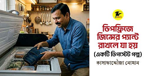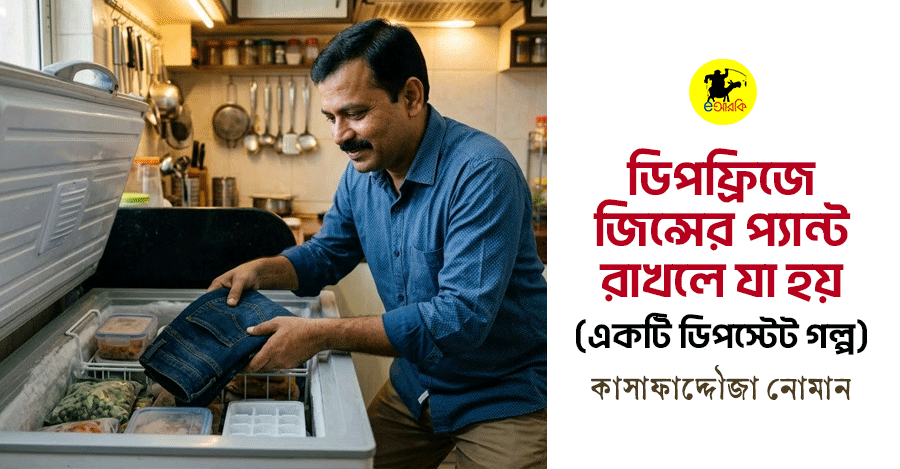 সকালে অন্যদিনের আগে উঠলাম। ফ্রেশ হয়ে ফ্রিজ থেকে বের করে দুরুদুরু মনে যখনই জিন্সটা নিয়ে পরতে গেলাম, তখনই স্ত্রী ঘুম থেকে উঠে হায়হায় করতে করতে বলল, এই! এই! করছো কী? করছো কী? পরার আগে জিন্সটা একটু ওভেনে গরম করে নাও।”