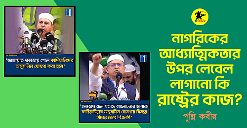 আর বাস্তবতা হলো, বাংলাদেশে ইসলাম একরকম না। বড় বড় মাজহাব আর ধারাগুলো নিজেরাই আলাদা। আছে হানাফি-দেওবন্দি, আছে বেয়ারেলভি বা পীরের অনুসারী সুন্নি ধারা, আছে সালাফি-ওহাবি, তাবলিগের ভেতরে আলাদা লাইন, শিয়া সম্প্রদায়ও আছে। এসব ভেতরেই ব্যাখ্যার পার্থক্য অনেক। এখন রাষ্ট্র যদি এক দলের কথা ধরে, তাহলে অন্যদের তো নাকচ করতেই হবে। আজ যারা অন্যকে অমুসলিম বলাতে চাচ্ছে, কাল ক্ষমতার পালা বদল হলে তারাই অন্য দলের টার্গেট হবে। এটার কোনো শেষ নাই।
