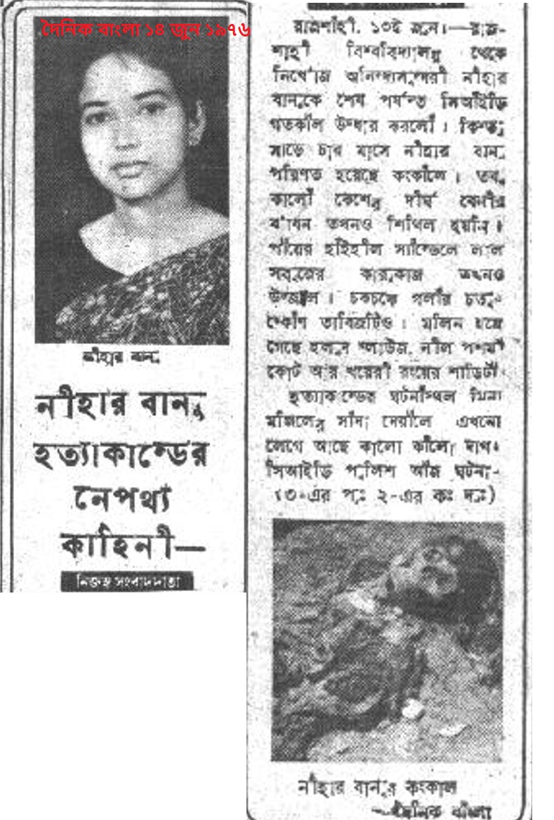 দৈনিক বাংলা, ১৪ জুন, ১৯৭৬-এ প্রকাশিত নীহার বানু হত্যাকাণ্ডের খবর