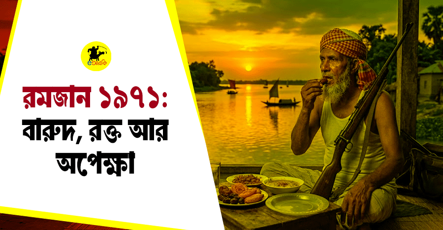 ওইদিকে ঢাকায় থমথমে সকাল। রাস্তাঘাট ফাঁকা, মোড়ে মোড়ে মেশিনগান। মানুষ নামাজে যাইতেছে ঠিকই, কিন্তু সিজদায় কাঁইন্দাও ভয় পায়। কে যে শান্তি কমিটির লোক, কেডা যে রাজাকার, কেডা যে খবর দিয়া দিবে কেউ জানে না। ইফতারের টাইমে ঘরে ঘরে থালা সাজানো, কিন্তু একটা জায়গা খালি। কারো ছেলে যুদ্ধে, কারো স্বামী নিখোঁজ। আমিনা বেগম খালের ধারে বসা আছে, চারপাশে লাশ আর পোড়া ঘরের গন্ধ। আকাশের দিকে চাইয়া কইতেছে, আল্লাহ, এই রমজানে রহমত নাই নাকি। কিন্তু ওই বছর আকাশ থেইকা নামছিল বারুদের গন্ধ।