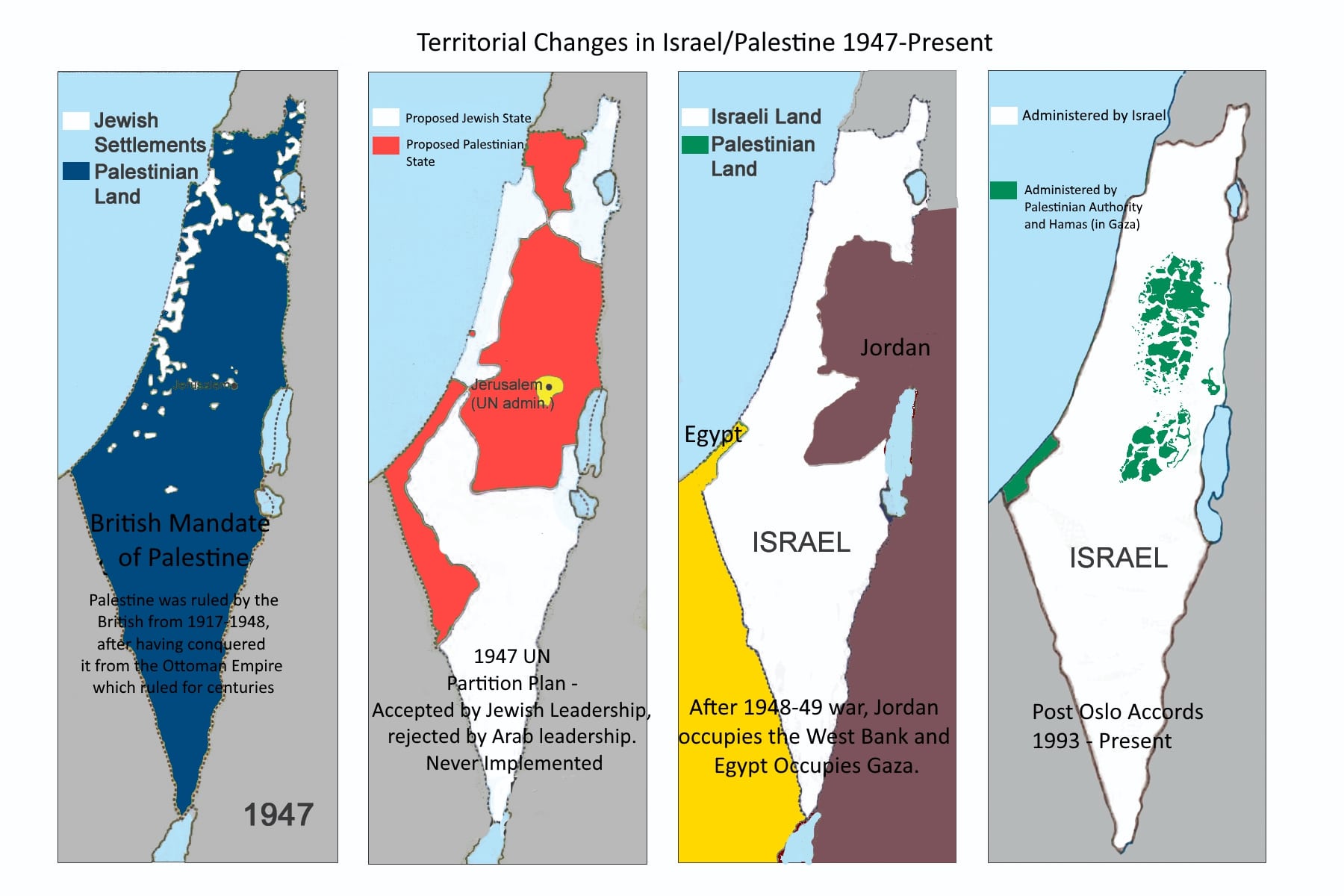 ৩# প্রায় দুই দশকের ব্রিটিশ শাসনের পর জাতিসংঘ ফিলিস্তিনকে দুই ভাগ করার একটি প্রস্তাব দেয়- এক ভাগ হবে স্বাধীন ইহুদী রাষ্ট্র, আরেক ভাগ হবে স্বাধীন আরব রাষ্ট্র। আর জেরুজালেম, যেটি ইহুদী এবং আরব উভয়ই নিজেদের রাজধানী হিসেবে দাবি করে, হবে একটি আন্তর্জাতিক শহর এবং এই শহরের আলাদা স্বীকৃতি ও নিয়ম থাকবে। ইহুদী নেতারা এই প্রস্তাব মেনে নিলেও আরব নেতারা এটি মানতে অস্বীকৃতি জানান। আরবরা তারও আগে থেকে সেখানকার শাসক গোষ্ঠী ব্রিটিশ এবং সেখানে বাস করতে আসা ইহুদীদের সঙ্গে সংঘর্ষে জড়িত ছিল। আরবরা দাবি করে ওই অঞ্চলে বেশিরভাগ জনগণ তাদের এবং তারা আরও বেশি ভূমি প্রাপ্য। কিন্তু তাদের সেই দাবি অগ্রহ্য হয় এবং আরবরা পুরো ফিলিস্তিনজুড়ে ভলিন্টিয়ার আর্মি তৈরি করতে থাকে।
