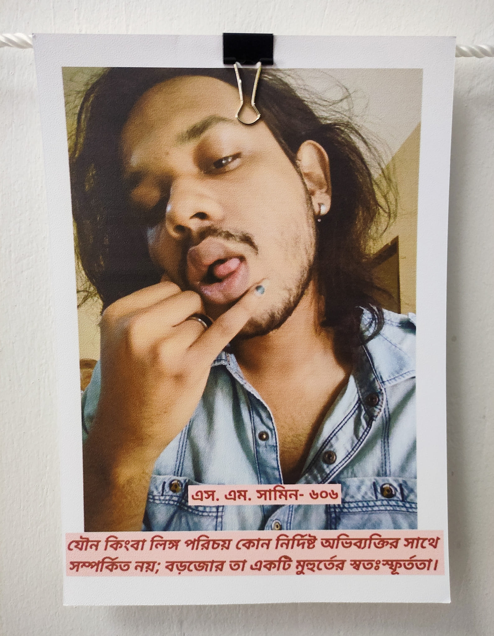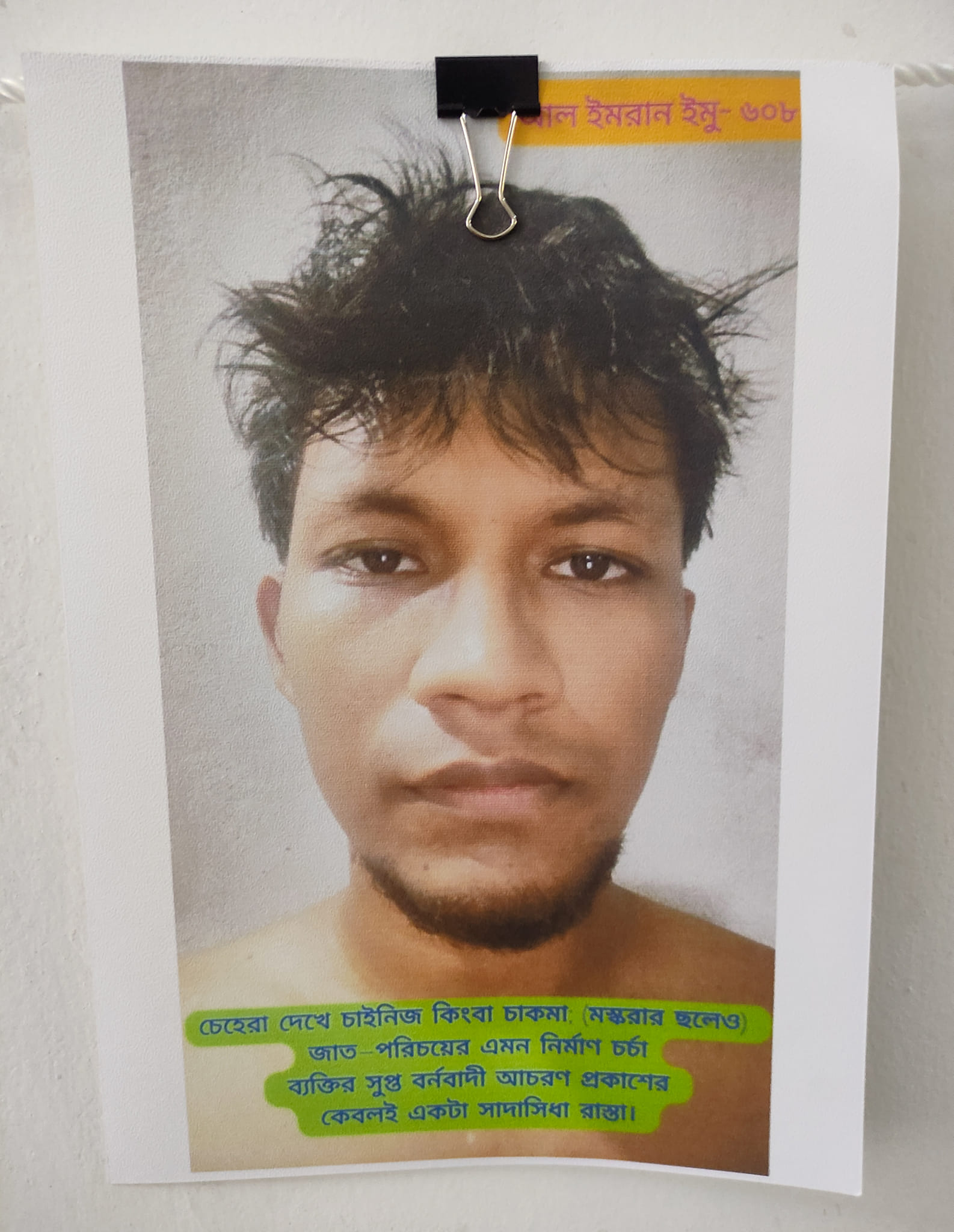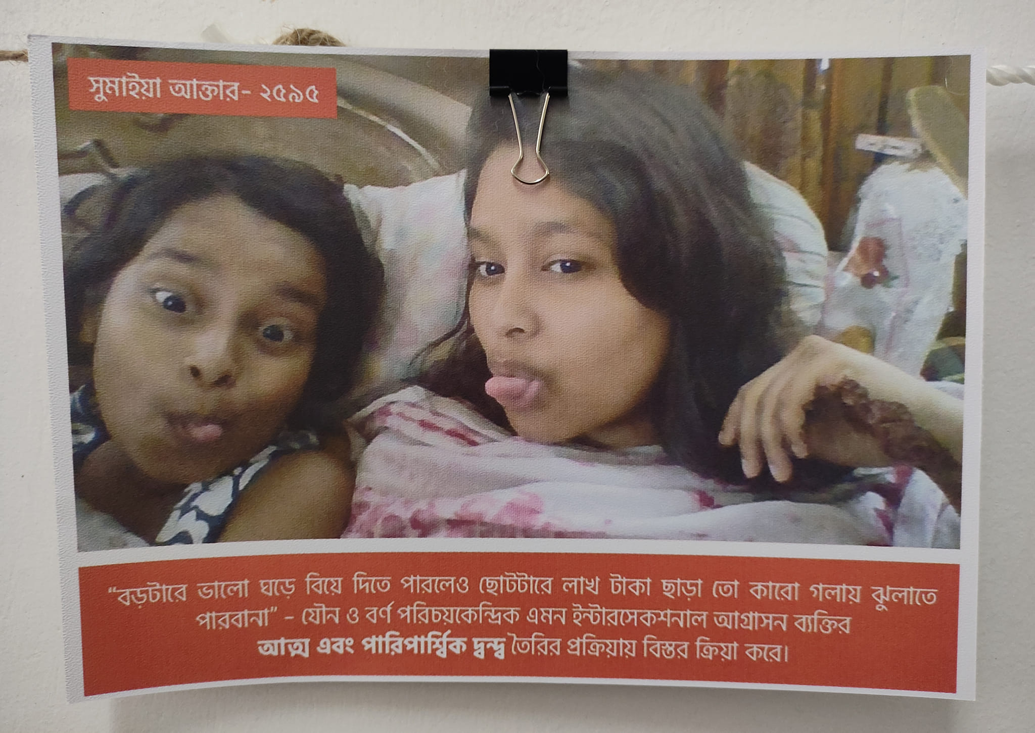 নৃবিজ্ঞান বিভাগের চতুর্থ বর্ষের শিক্ষার্থীদের Emerging Issues কোর্সের নির্ধারিত কাজের এই প্রদর্শনীর নাম দেয়া হয়েছে, ‘নিজের মুখচ্ছবির পাশাপাশি পাঞ্চলাইন পেশ (বর্ণবাদ ও যৌনতা সম্পর্কিত)’। নিজের ছবির সাথে সমাজের এইসব বৈষম্য, ভুল ধারণার বিরুদ্ধে কিছু বার্তাও দিয়েছেন তারা। কোর্সটির শিক্ষক হিসেবে আছেন মানস চৌধুরী।