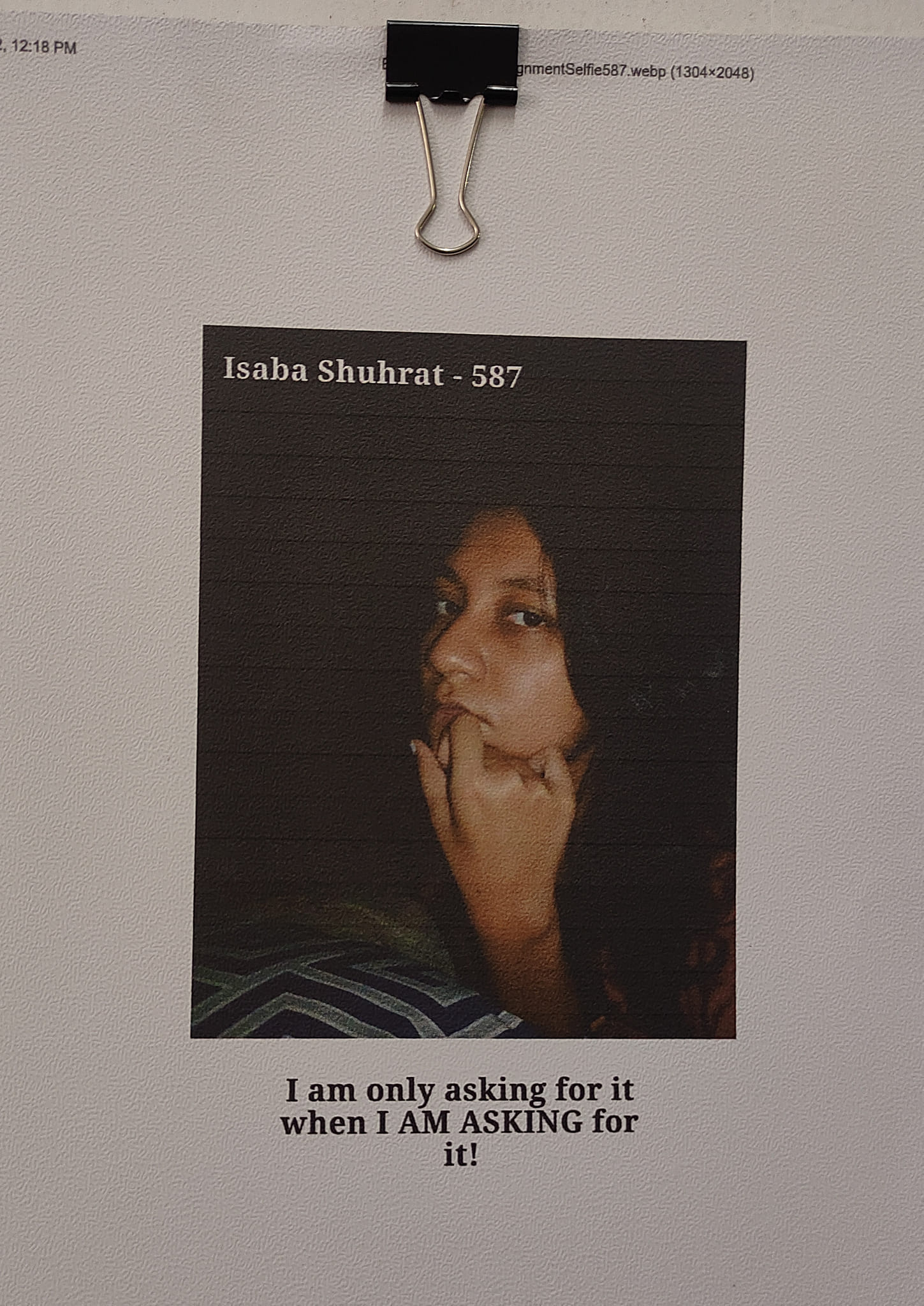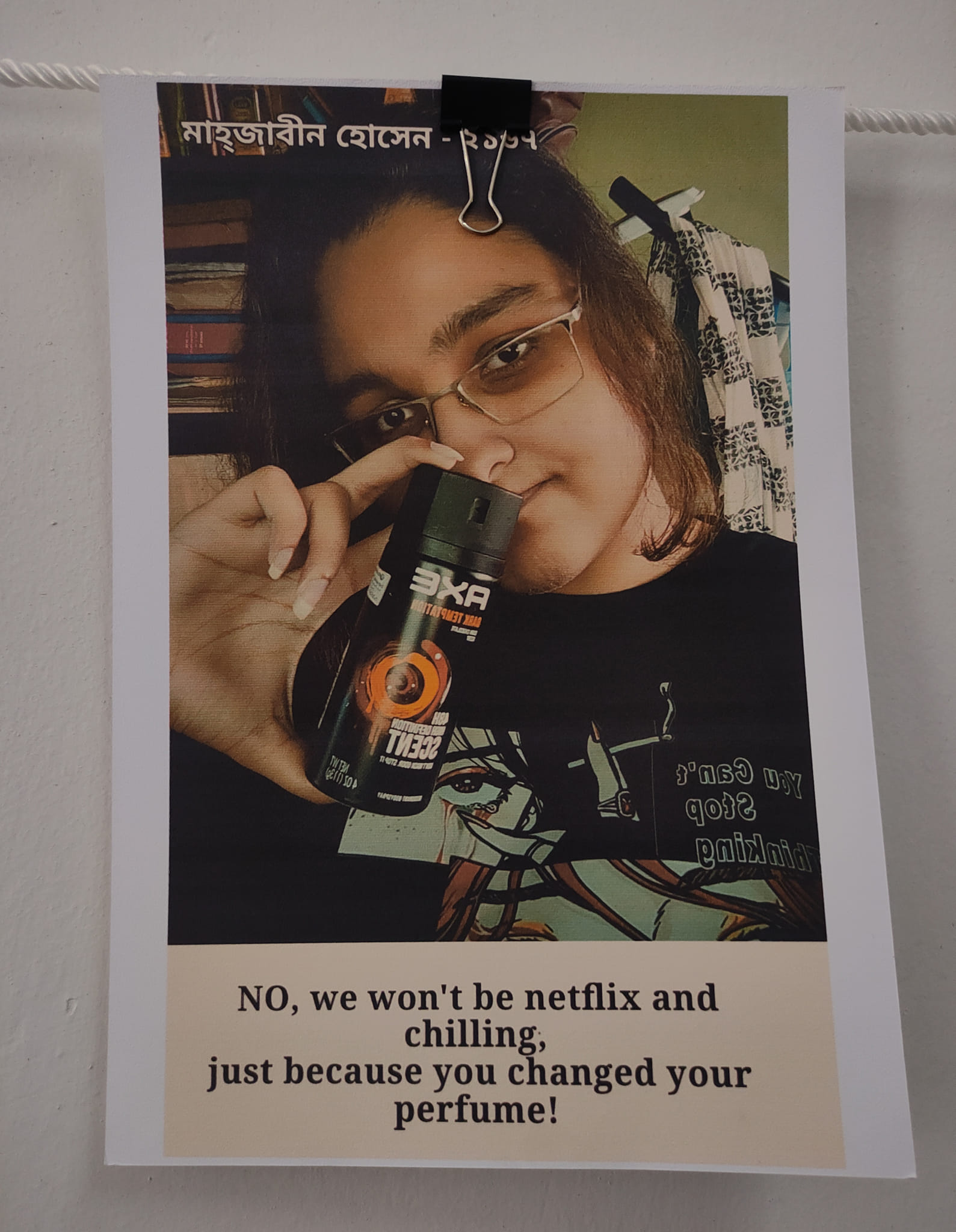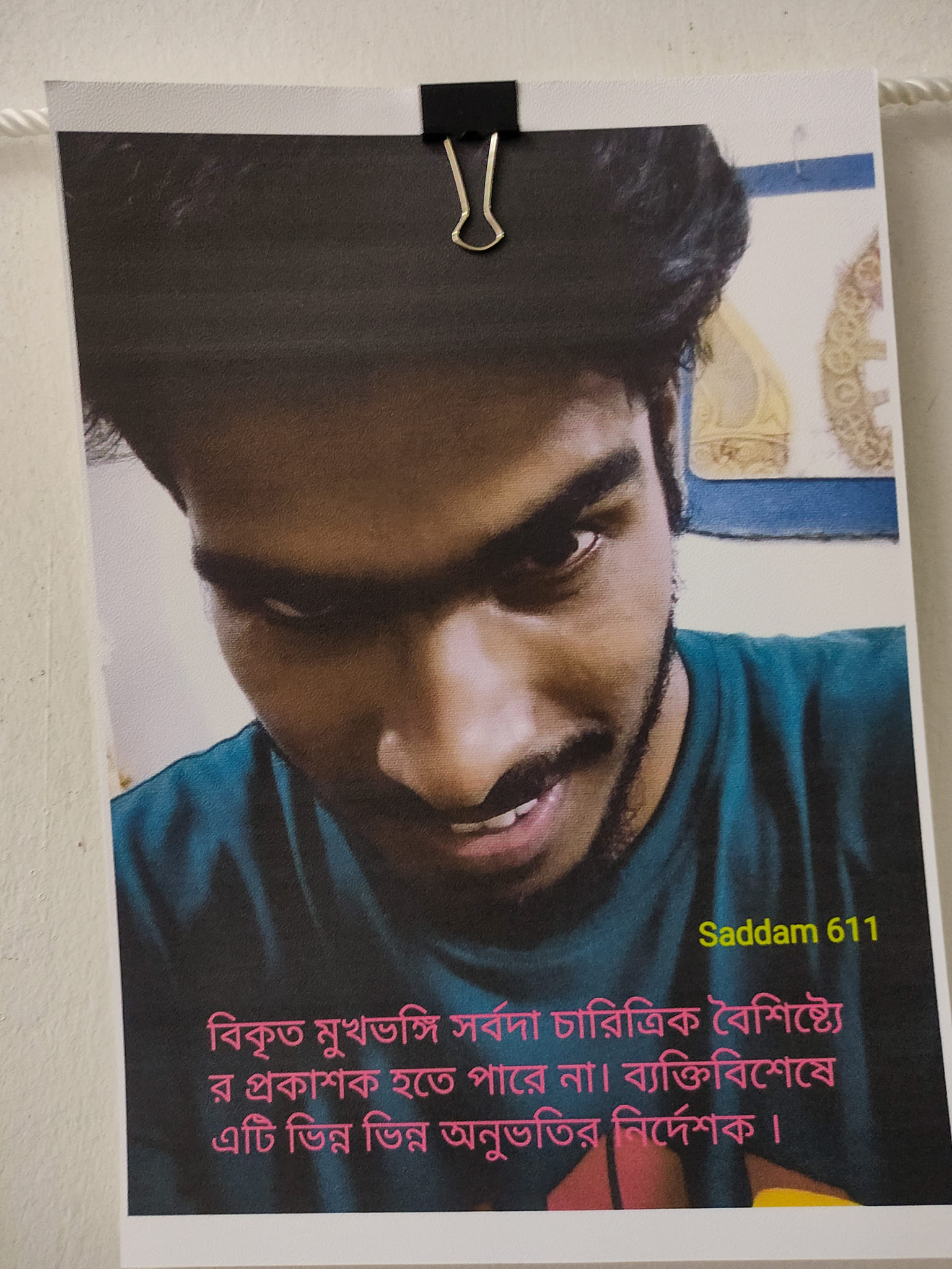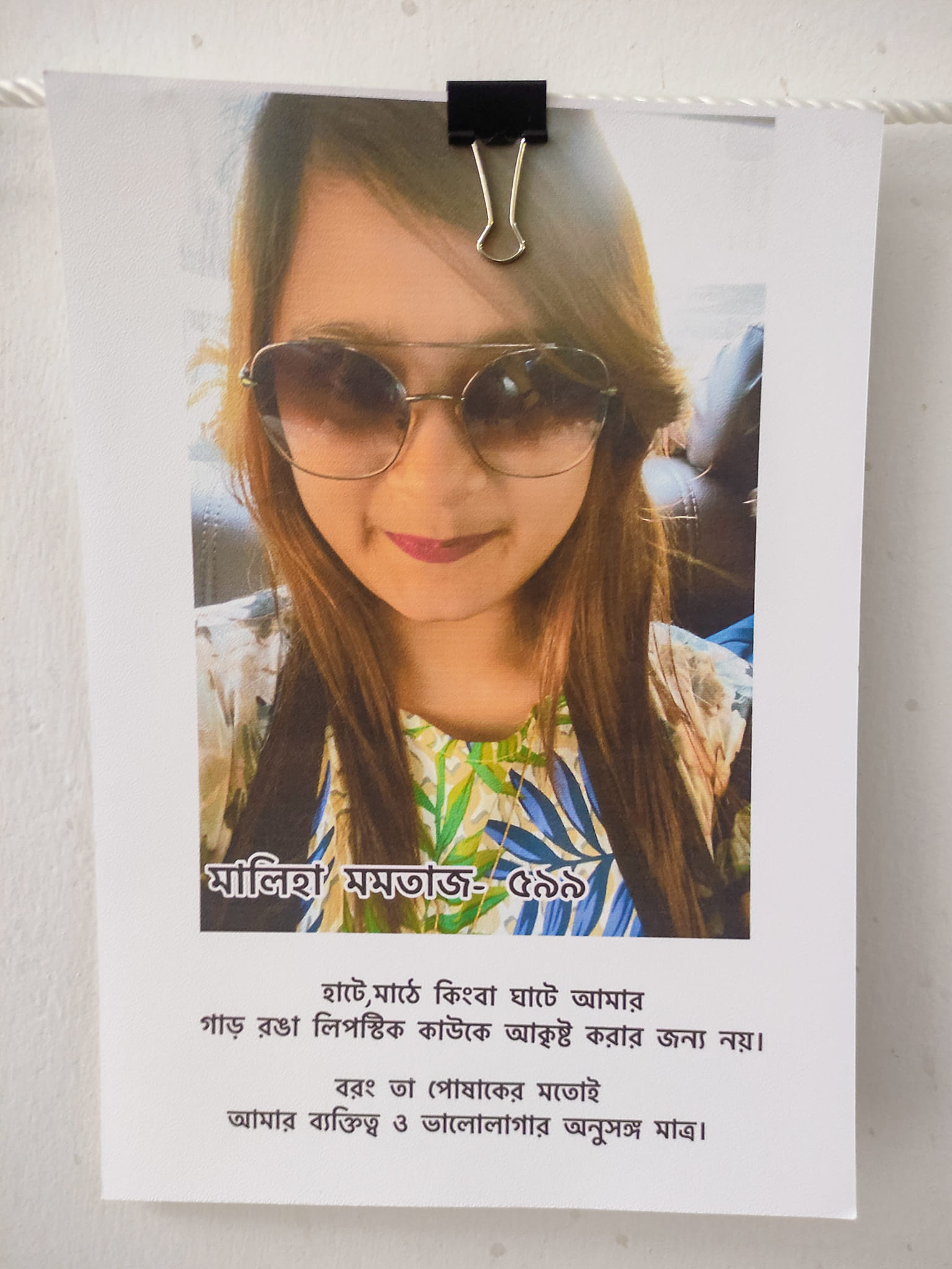 নৃবিজ্ঞান বিভাগের চতুর্থ বর্ষের শিক্ষার্থীদের Emerging Issues কোর্সের নির্ধারিত কাজের এই প্রদর্শনীর নাম দেয়া হয়েছে, ‘নিজের মুখচ্ছবির পাশাপাশি পাঞ্চলাইন পেশ (বর্ণবাদ ও যৌনতা সম্পর্কিত)’। নিজের ছবির সাথে সমাজের এইসব বৈষম্য, ভুল ধারণার বিরুদ্ধে কিছু বার্তাও দিয়েছেন তারা। কোর্সটির শিক্ষক হিসেবে আছেন মানস চৌধুরী।