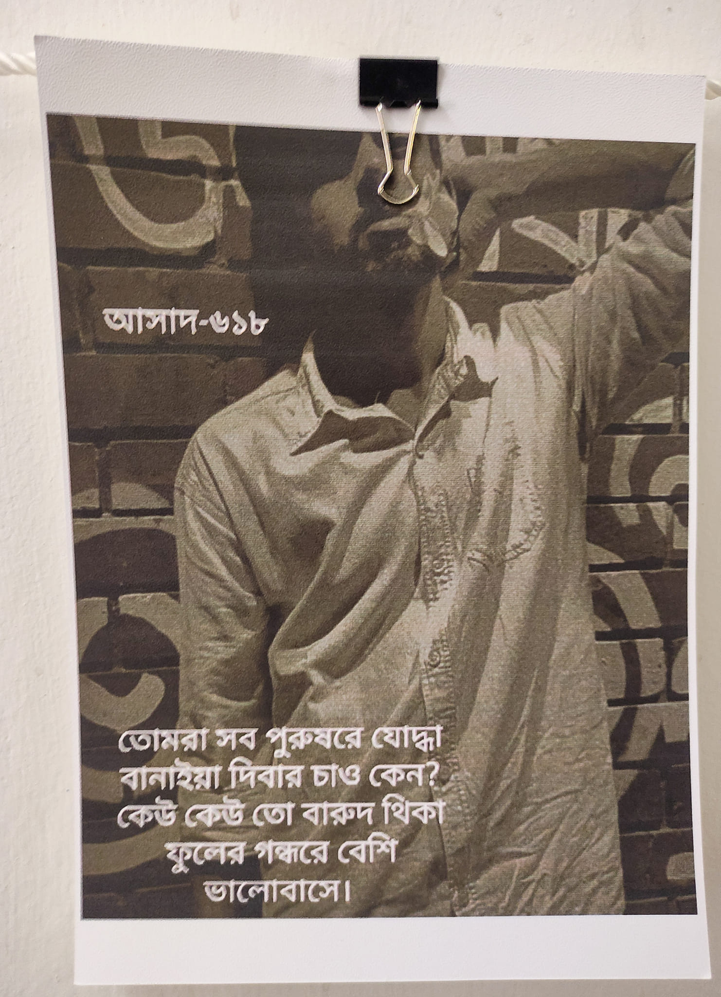 পুরুষ মানেই যোদ্ধা নয় এমন বার্তা দিতে চেয়েছেন অন্য এক ছাত্র। নিজের ছবির সাথে তিনি লিখেছেন, ‘তোমরা সব পুরুষরে যোদ্ধা বানাইয়া দিবার চাও ক্যান? কেউ কেউ তো বারুদ থিকা ফুলের গন্ধরে বেশি ভালোবাসে।‘