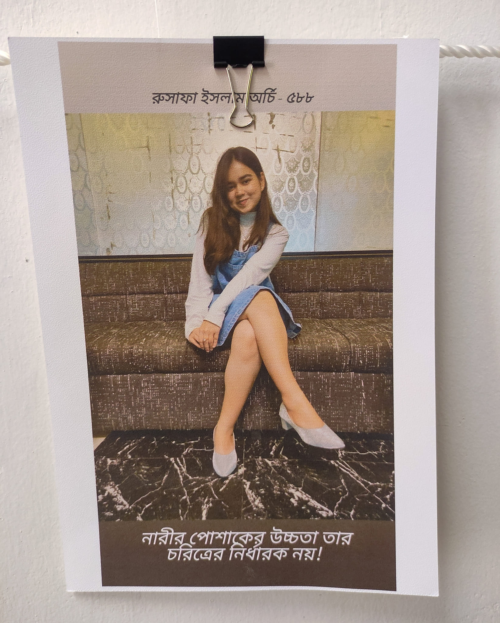 এছাড়া ভার্জিনিটি, নারীর পোশাক, ছেলেদের লম্বা চুল রাখা সহ নানান সাজ পোশাক ও স্বাধীনতা নিয়ে নানাবিধ বার্তা দেয়ার চেষ্টা করেছেন শিক্ষার্থীরা। প্রদর্শনীটি চলছে ২৭ সেপ্টেম্বর পর্যন্ত। আগ্রহী যে কেউ নৃবিজ্ঞান বিভাগের শিক্ষক করিডোরে গিয়ে প্রদর্শনীটি দেখে আসতে পারেন।