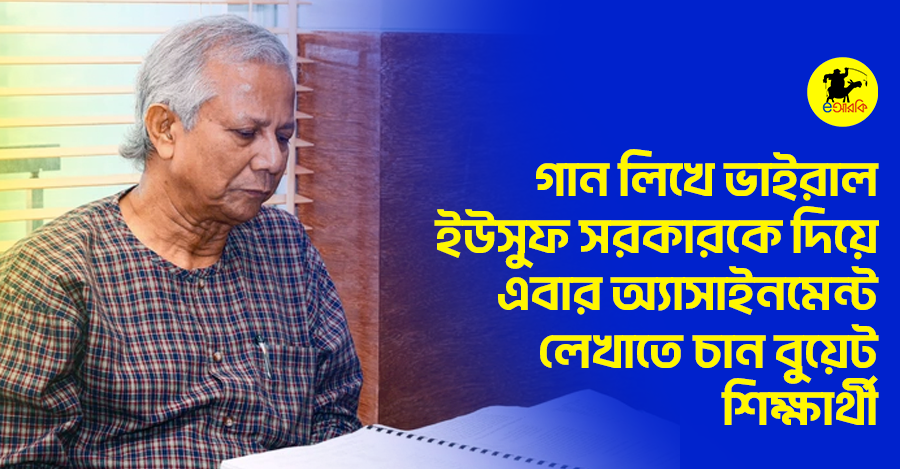 বাংলাদেশের শিক্ষার্থীদের মাঝে নতুন উত্তেজনা! বিপিএলের থিম সং লিখে সারা দেশে আলোচনার কেন্দ্রে থাকা ইউসুফ সরকারকে এবার এসাইনমেন্ট লেখানোর দাবি তুলেছেন বুয়েটের শিক্ষার্থীরা। নিজেদের ব্যস্ত জীবনে একটু স্বস্তির জন্য এসাইনমেন্টের মত তুচ্ছ বিষয় সরকারের উপর ই ছেড়ে দিতে চান তারা।