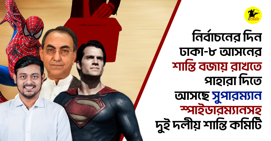 এগুলো চোখ এড়ায়নি আমাদের প্রিয় সব পাওয়ারফুল সুপারহিরোদেরও। তাই আসন্ন ১২ ফেব্রুয়ারী নির্বাচনের দিনে ঢাকা-৮ আসনে যেন অনাকাঙ্ক্ষিত কোনো ঘটনা না ঘটে সেজন্য আসছে সুপারম্যান, স্পাইডারম্যান, ব্যাটম্যান, আয়রনম্যান, ক্যাপ্টেন আমেরিকাসহ সকল সুপারহিরোরা। এই আসনের শান্তি ফিরিয়ে আনতে ডিসি ইউনিভার্স ও মার্ভেল ইউনিভার্স একসাথে কাজ করবে বলেও সিদ্ধান্ত নিয়েছে। গঠিত হবে দুই দলীয় শান্তি কমিটি।