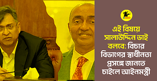 অনেকে মনে করছেন এই কারণেই আইনমন্ত্রীর এমন সিদ্ধান্ত! আইনমন্ত্রী সম্ভবত বুঝে গেছেন, মুখ খুললেই বিচার বিভাগের স্বাধীনতা নিয়ে জটিল উত্তর দিতে হবে। তার চেয়ে সালাউদ্দিন ভাইয়ের ওপর দায়িত্ব ছেড়ে দিয়ে নিশ্চিন্তে চা খাওয়া অনেক নিরাপদ। কারণ, সালাউদ্দিন ভাই যখন বলবেন, তখন আইন-কানুন সব পানির মতো পরিষ্কার হয়ে যাবে।