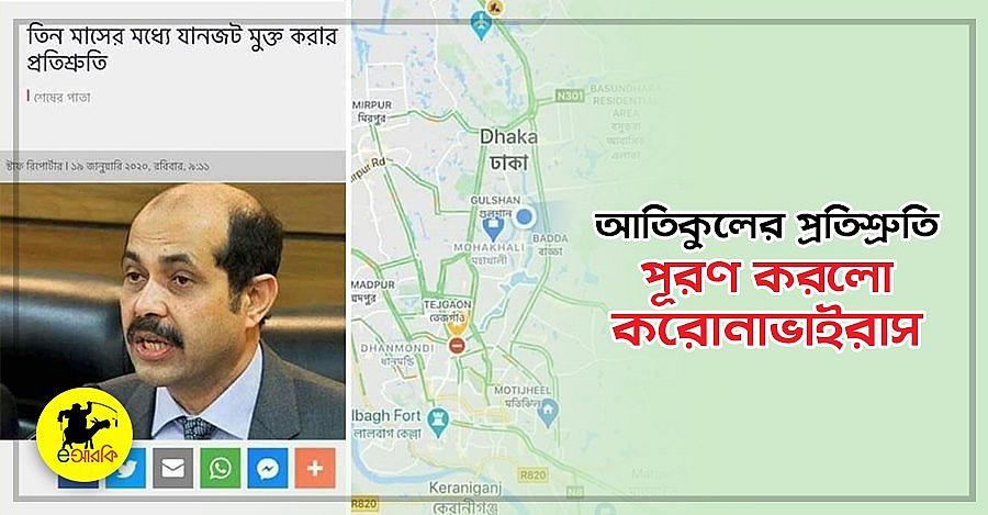 কিন্তু কি অবাক কান্ড! অবিশ্বাস্য এক মিরাকল ঘটিয়ে ফেলেছেন আতিকুল। মাত্র দুই মাস যেতে না যেতেই ঢাকার কোনো রাস্তায় দেখা পাওয়া যাচ্ছে না জ্যামের। শুধু তাই না, ঢাকার রাস্তাঘাট-অলিগলি এত খালি ছিল না ঈদ-উৎসব কখনোই! তবে সবচাইতে অবাক করা বিষয়, এই সাফল্যকে ভালোভাবে দেখছে না জনগণ। তাদের দাবি, আতিকুল নয়, জ্যাম দূর হয়েছে করোনাভাইরাসের জন্য।