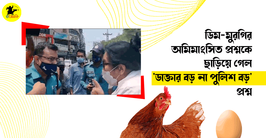 আজ বাংলাদেশের এক পুলিশ ও এক ডাক্তারের নিজেদের বড় প্রমাণ করার এক কঠিন মৌখিক যুদ্ধের পর ডিম-মুরগি আবারও হুমকির মুখে। ধারণা করা হচ্ছে, ভবিষ্যতে 'ডিম আগে না মুরগি' আগে প্রশ্নকে ছাড়িয়ে 'ডাক্তার বড় না পুলিশ বড়' প্রশ্নটি বিশ্ববাসীর মুখে মুখে ঘুরে বেড়াবে।