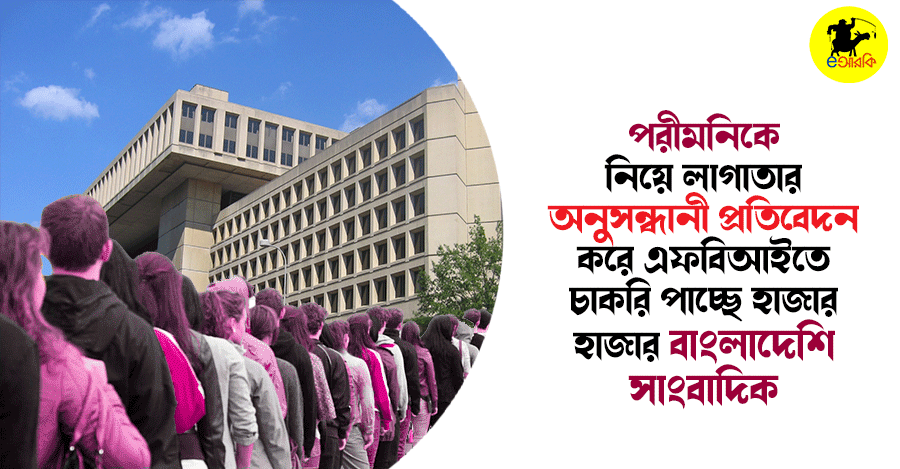 তদন্ত কর্মকর্তা হিসেবে বাংলাদেশ থেকে সাংবাদিক আমদানি করছে আমেরিকার ফেডারেল ব্যুরো ইনভেস্টিশন (এফবিআই)। একটি সম্পূর্ণ ভূয়া তথ্য সূত্র থেকে জানা যায়, পরীমনিকে নিয়ে বাংলাদেশি সাংবাদিকদের লাগাতার অনুসন্ধানী প্রতিবেদনগুলো নজর কেড়েছে তাদের। এদেশের সাংবাদিকদের অনুসন্ধানী মেধা, লেগে থাকার প্রজ্ঞা ও সূক্ষাতিসূক্ষ বিষয়ে নিবিড় পর্যবেক্ষণ এফবিআই এর কর্মকর্তাদের মুগ্ধ করেছে। নিজেদের অভ্যন্তরীণ ও আন্তর্জাতিক নানা বিষয়ে অনুসন্ধানের জন্য পরীমনি বিভাগে কাজ করা কয়েক হাজার সাংবাদিককে চাকরি দিবেন বলে একটি ভূয়া সূত্র মাধ্যমে জানান তারা৷