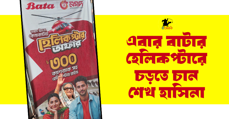 ঈদের বাজারে চলছে হরদম অফার। এই ব্র্যান্ড একটা অফার তো সেই ব্র্যান্ড আরেকটা অফার। দেশের নামিদামি থেকে শুরু করে অজানা সব ব্র্যান্ডের নানা মুখরোচক অফারের মাঝেই দেখা মিলল দেশের অন্যতম জুতার ব্র্যান্ড বাটার হেলিকপ্টার রাইড অফার। কিছু শর্ত মেনে বাটাতে শপিং করলেই দিচ্ছে হেলিকপ্টার রাইডের সুবিধা। আর এটি দেখেই আবেগে আপ্লুত হয়ে গেছেন শেখ হাসিনা।