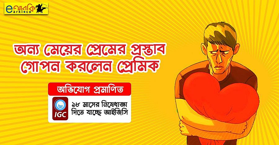 বাংলাদেশের প্রেমিকদের বড় একটা দুঃসংবাদ দিতে যাচ্ছে বিশ্বপ্রেমিকাদের সর্বোচ্চ নিয়ন্ত্রক সংস্থা আন্তর্জাতিক গার্লফ্রেন্ড'স কাউন্সিল (আইজিসি)। নাজমুস সাকিব নামের জনৈক প্রেমিক আইজিসির ১৮ মাসের নিষেধাজ্ঞার মুখে পড়তে যাচ্ছেন। দুই বছর আগে নিজের গার্লফ্রেন্ড ব্যতীত অন্য একটি মেয়ের কাছ থেকে প্রেমের প্রস্তাব পেয়েছিলেন সাকিব। সেটি তৎক্ষণাৎ প্রত্যাখ্যান করলেও বিষয়টি গার্লফ্রেন্ডকে না জানিয়ে গোপন করেন তিনি। বিষয়টি পরে আইজিসির একজন সদস্য (তার গার্লফ্রেন্ডের ক্লোজ ফ্রেন্ড/বেস্টি) জানতে পারে। পরে প্রেমিকের কল রেকর্ড চেক করে এ ব্যাপারে তারা তথ্য উদ্ধার করে। পূর্বেও অন্যদের বয়ফ্রেন্ডকে প্রেমের প্রস্তাব দেয়া ওই মেয়ে আইজিসির কালো তালিকায় থাকাদের একজন।