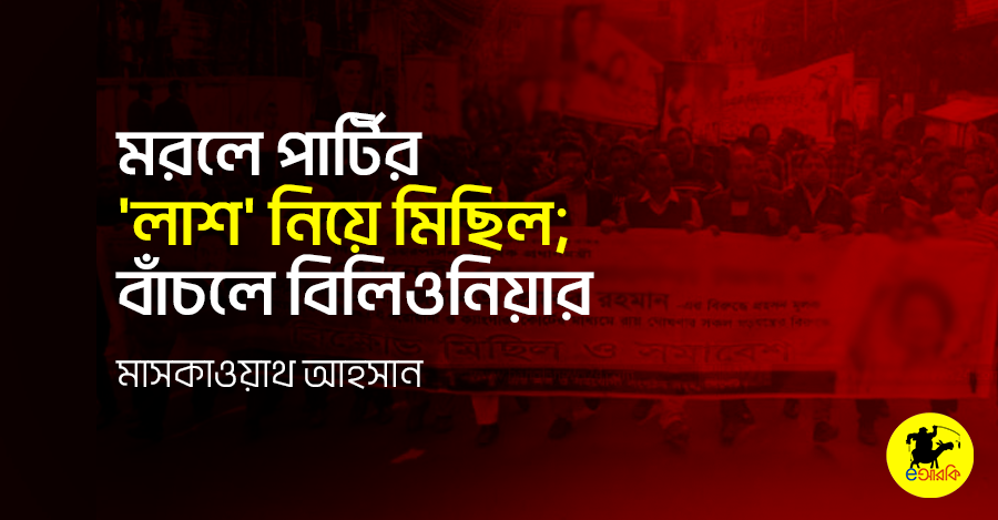 রাজপথে আজকের লড়াই দলদাস খুনেদের বাঁচামরার লড়াই। জনগণকে কখনো মজলুম কখনো প্রজা বলে; তাদের মুক্তির লিপসার্ভিসের কথা বলে দুটি ডাকাত দল; সংবিধানের কসম দেয়; যাত্রার আলকাপের নৃত্যের চেয়েও মনোহর এইসব থাগস অফ বেঙ্গলের রুমাল নৃত্য; যাতে ৫২ বছর ধরে ফাঁস দিচ্ছে অবরুদ্ধ জিম্মি জনগণের গলায়।