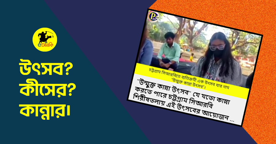 শনিবার (৩০ ডিসেম্বর) বেলা ৩টা থেকে বিকেল ৫টা পর্যন্ত নগরীর সিআরবির শিরীষতলায় অনুষ্ঠিত এ কান্না উৎসবে ২৫ জন বিভিন্ন বয়সের তরুণ-তরুণী অংশ নিয়েছেন। ইস্টার্ন ইউনিভার্সিটি থেকে ফিল্ম অ্যান্ড মিডিয়া বিভাগে স্নাতকোত্তর করা টুটুল চৌধুরী নামে এক যুবক এ উৎসবের আয়োজন করেছেন। টুটুল পরিবেশবাদী হিসেবেও বেশ পরিচিত।